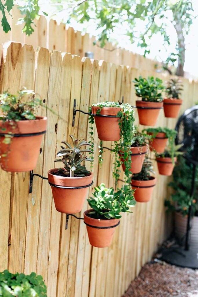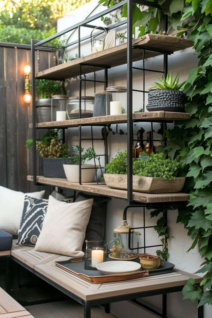 Wall planters, hanging shelves, hooks, mounted lanterns, and vertical gardens help keep the patio functional without cluttering walkways.