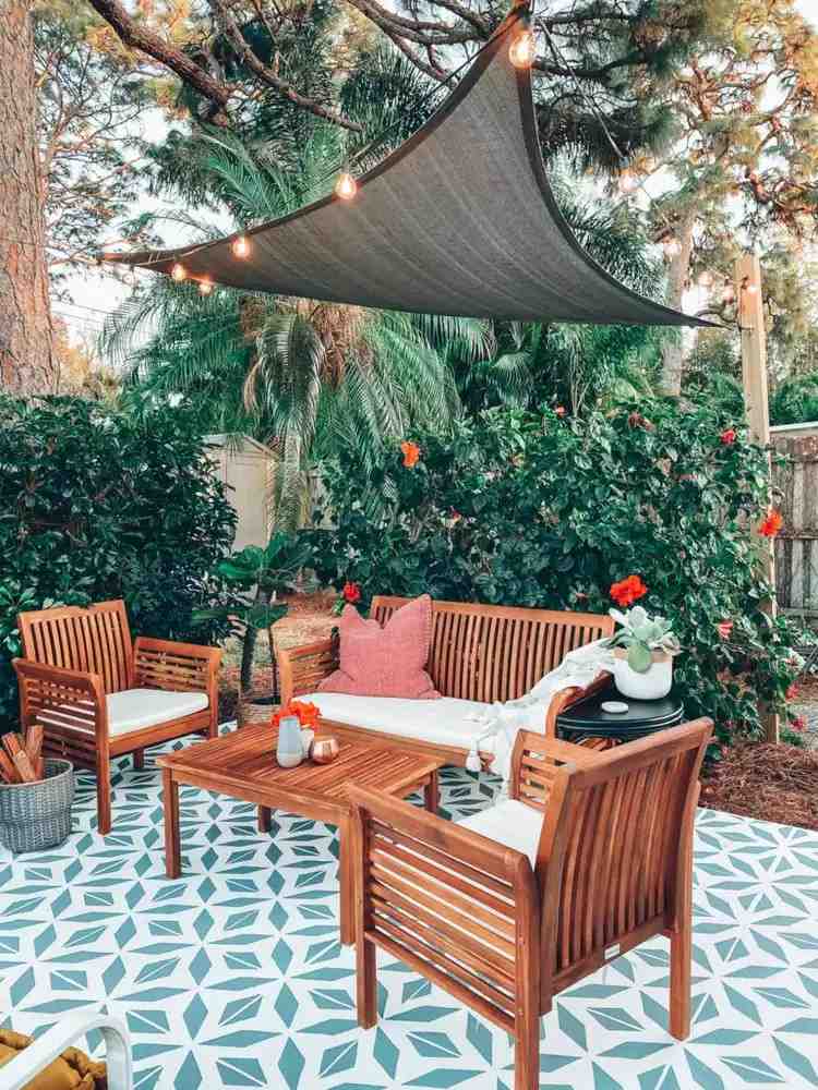A painted checkerboard floor, geometric stencil, or soft neutral color instantly makes the patio feel designed. Rental-friendly patio tiles work too if painting isn’t possible.
