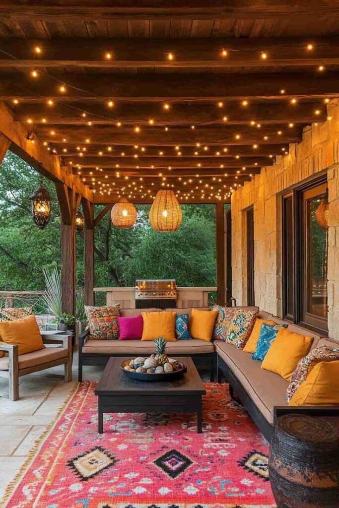 Hanging lights, plants, lanterns, or even outdoor bead strands pull the eye upward and make the space feel taller.