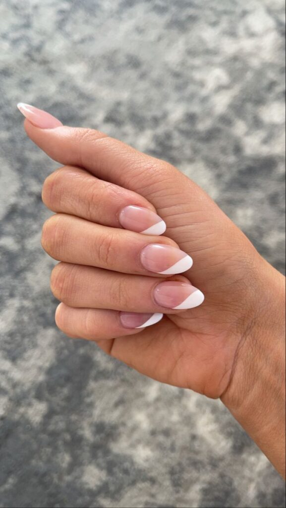 If you adore the classic French nails but want a change, try this: instead of a rounded white tip, draw a straight line on one side. It’s surprisingly easy to do!