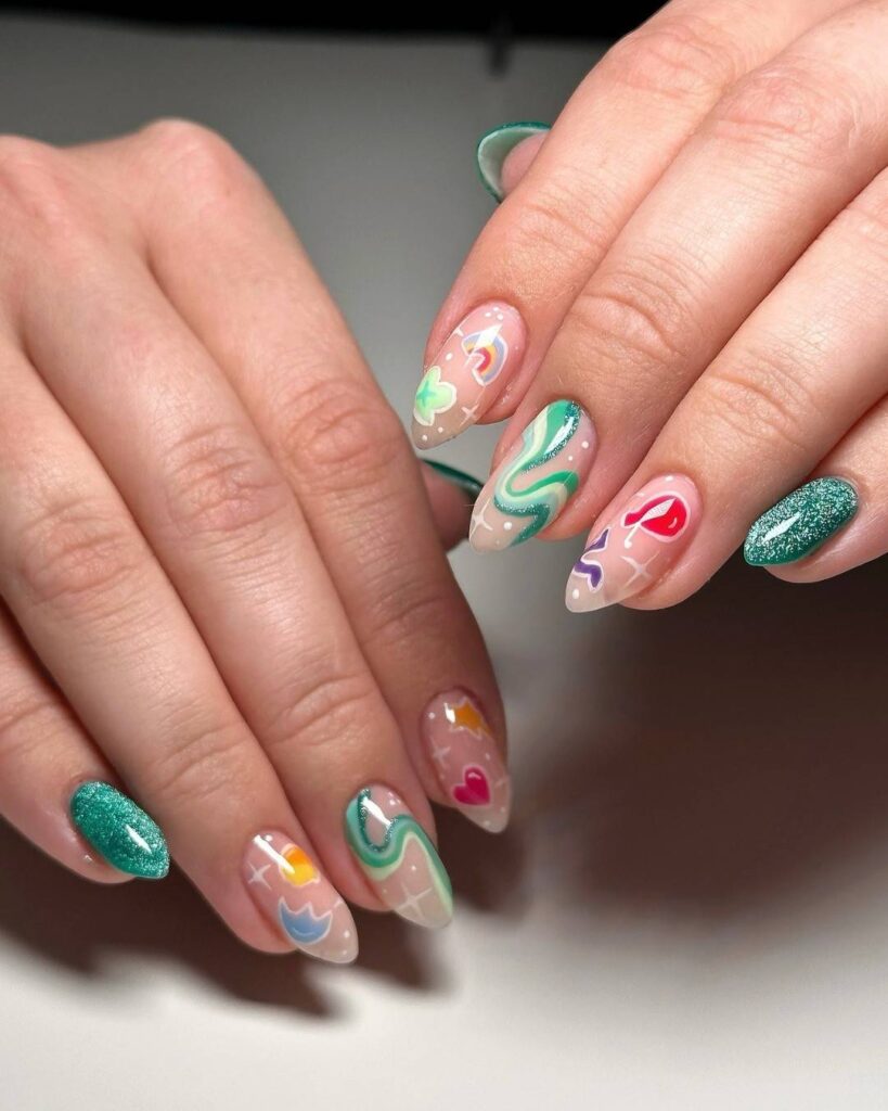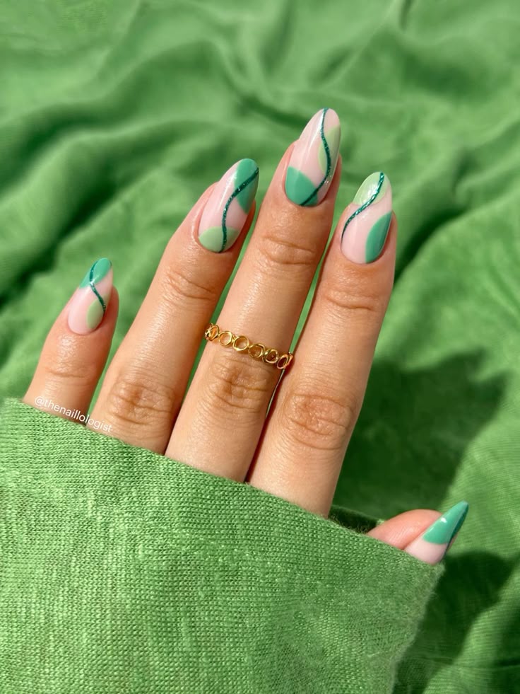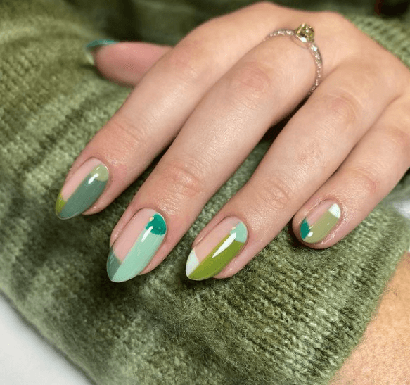 These nails really stand out! Get creative with a mix of green shades in an abstract design.
