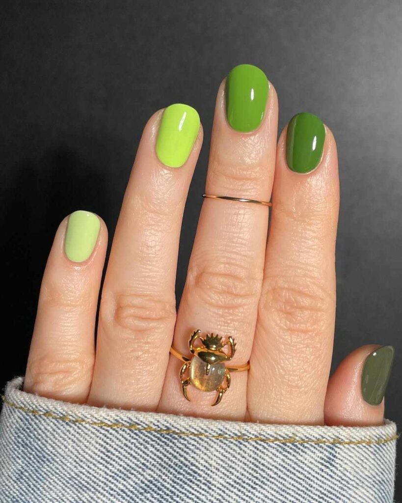 Using different shades of green on each short nail keeps the look playful, eye-catching, and super easy to wear.