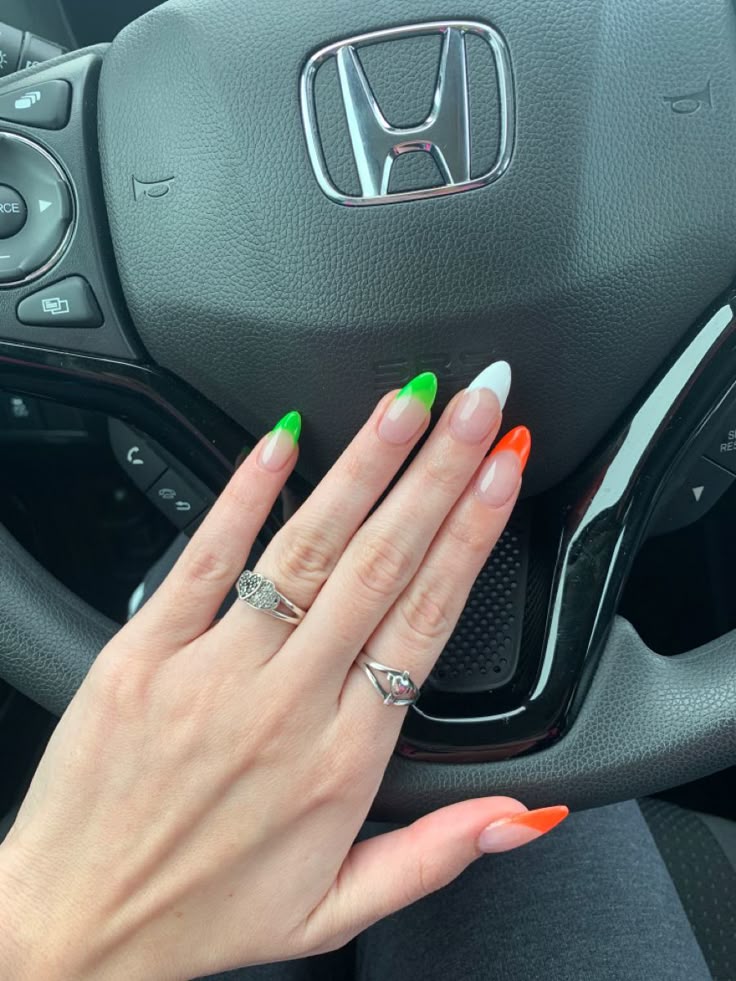 Paint your nails with the colors of the Irish flag, green, white, and orange.
