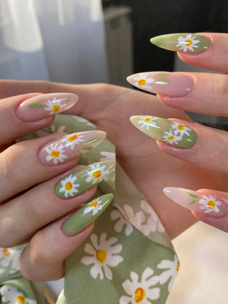 Embrace nature’s beauty by pairing different green shades with floral touches for an elegant and fresh St. Patrick’s Day nail design.