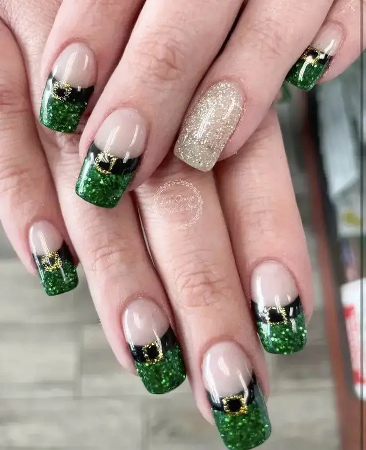 Add a fun vibe to your nails by making tiny leprechaun hats using black and green polish, plus a bit of glitter for that extra sparkle.