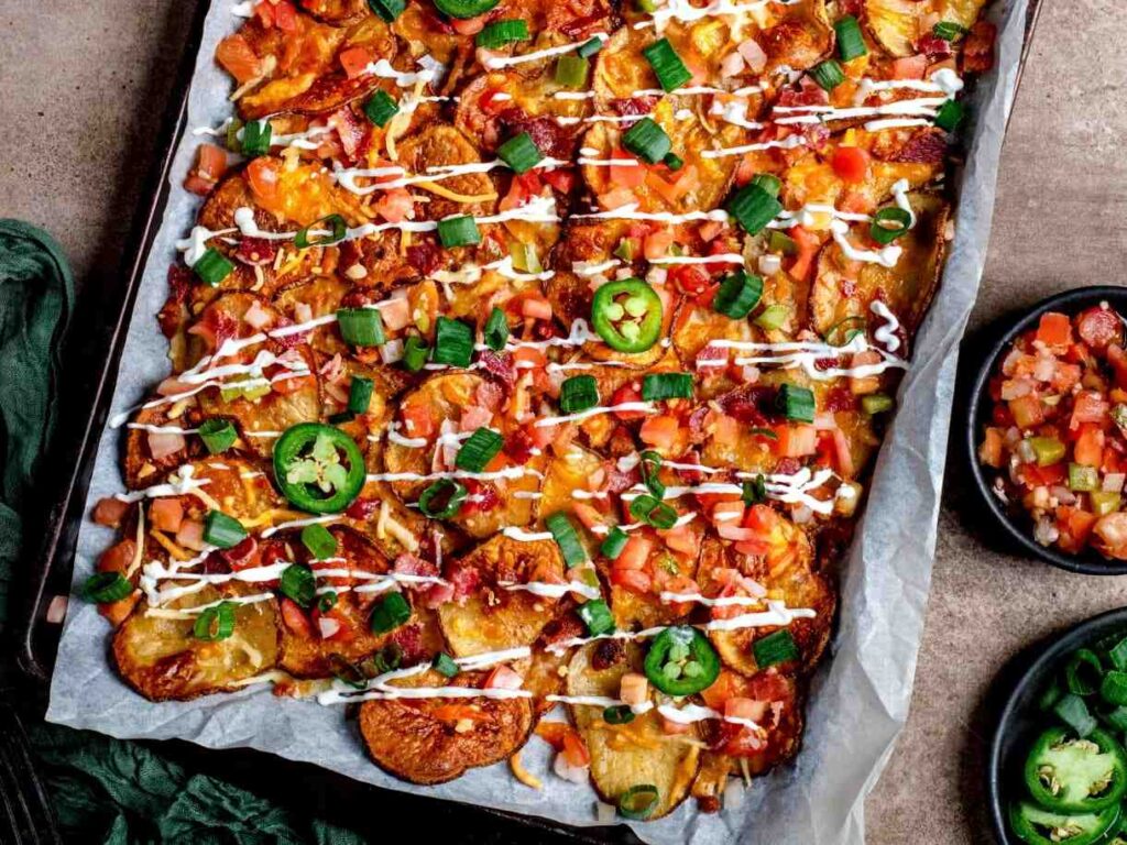 Crispy potatoes topped with cheese, bacon, and green onions feel hearty, fun, and perfect for sharing.