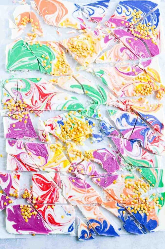 Swirl white chocolate, add colors and sprinkles, and break it into shards.