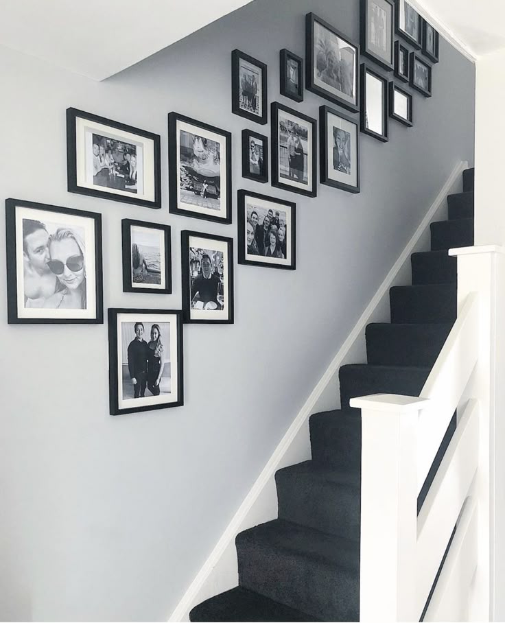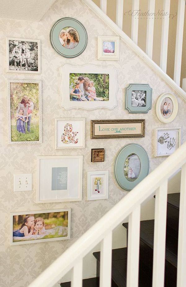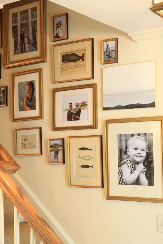 Instead of clustering photos randomly or forcing them into a straight grid, arrange them chronologically along a single diagonal line that follows your stair angle.