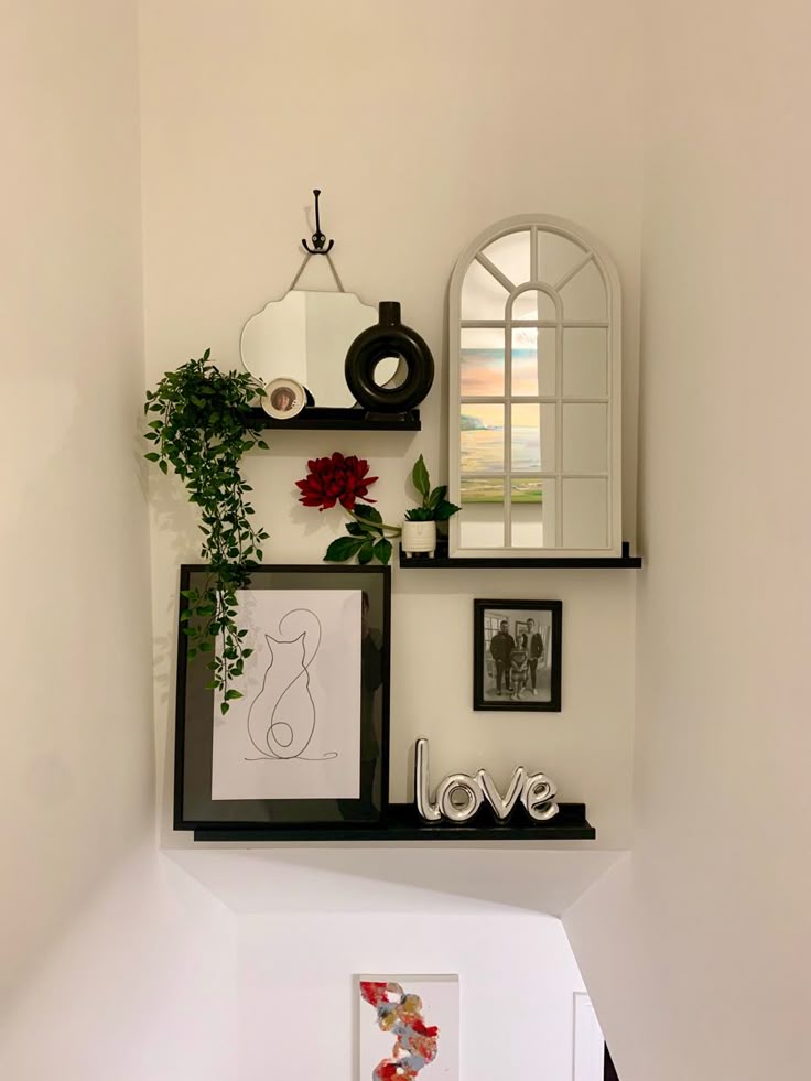 Mount slim floating shelves along the staircase wall and use them to layer frames, small plants, and a few meaningful objects.