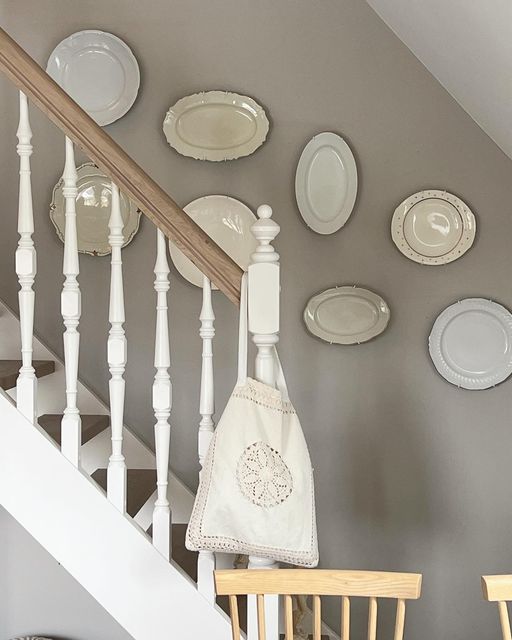 Install small plate hangers and mount vintage ceramic plates directly on the staircase wall.