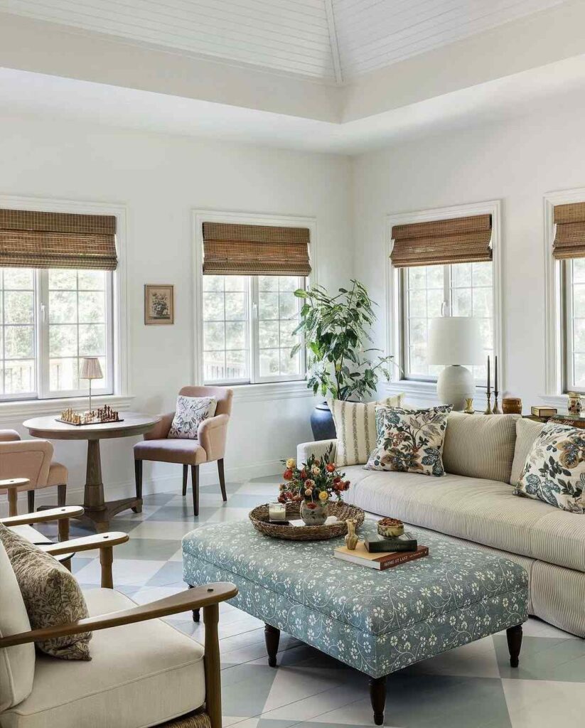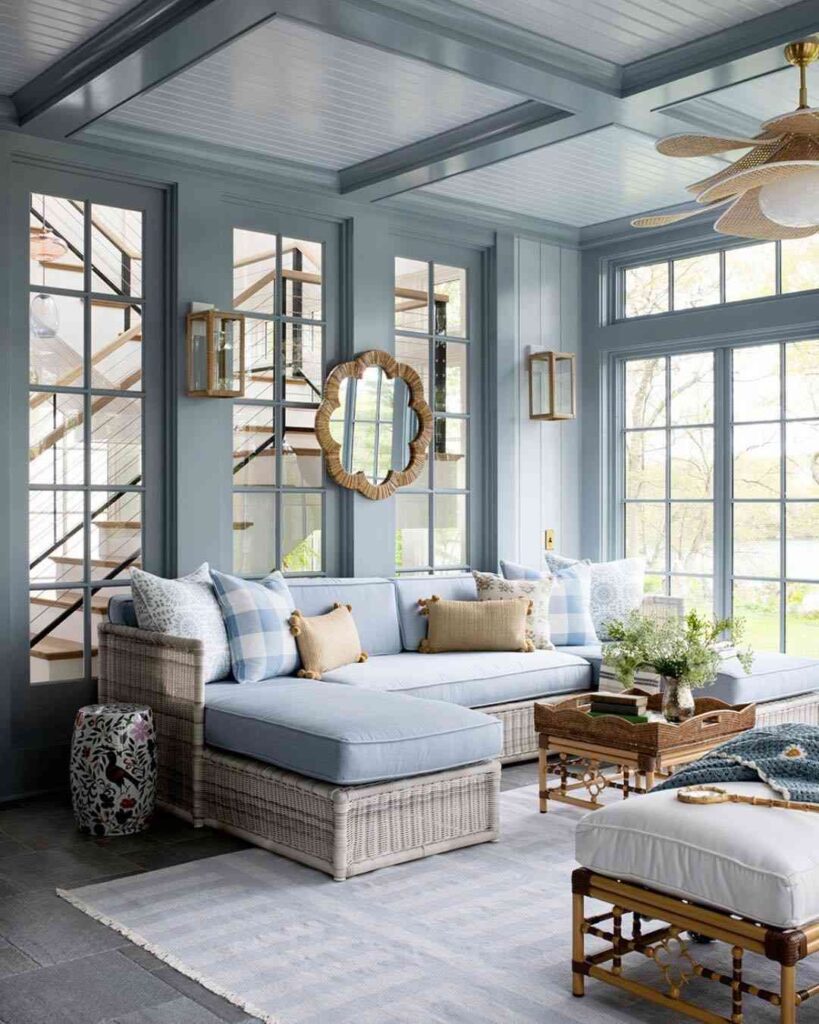 Woven elements like rattan chairs, baskets, or light fixtures instantly add warmth to a sunroom.