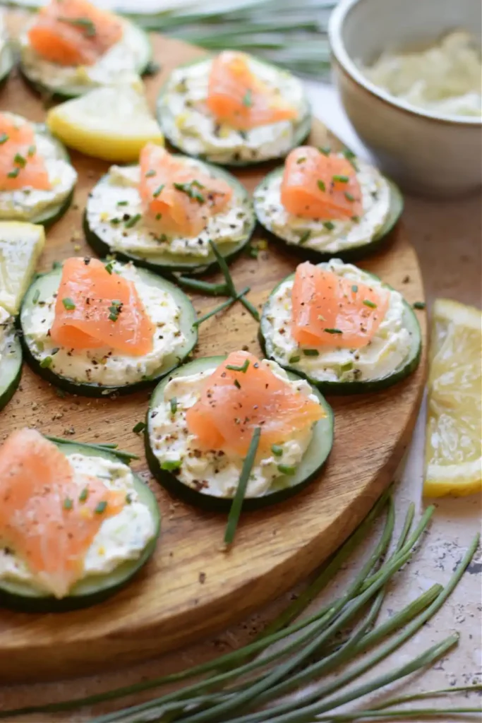 Thin cucumber slices topped with cream cheese, smoked salmon, and dill.