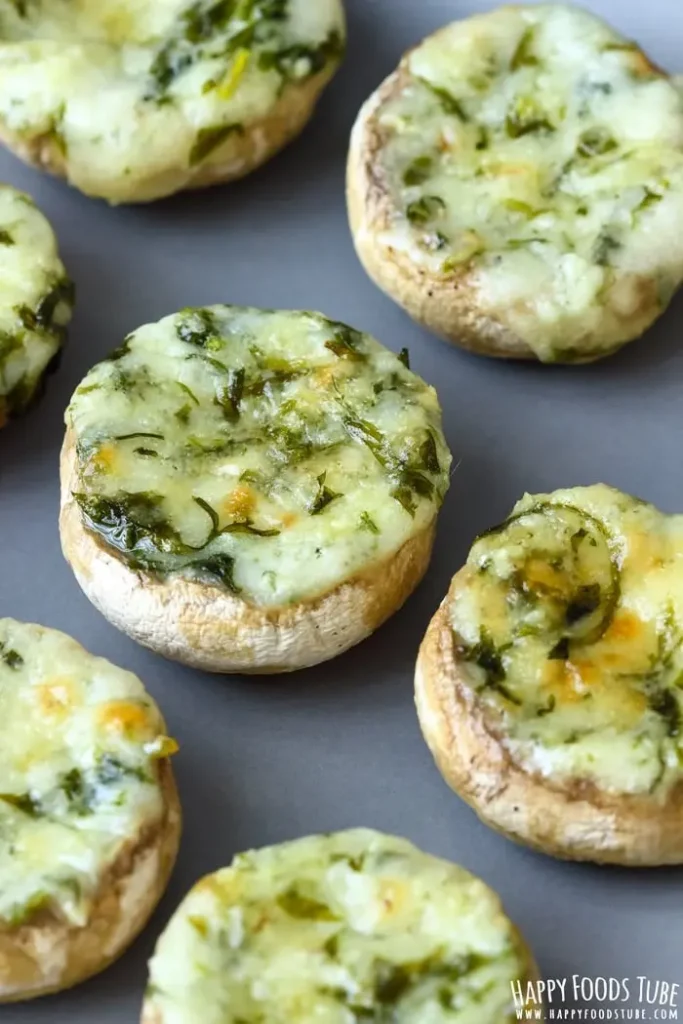 The caps get filled with a herby, garlicky cream cheese mixture, then roasted until bubbling and golden on top.