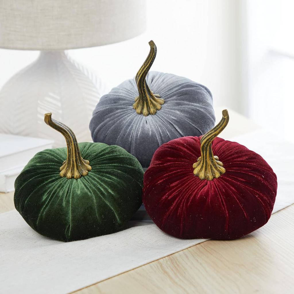 For a cozy yet chic twist, swap classic pumpkins for velvet ones in jewel tones like emerald, plum, and navy.