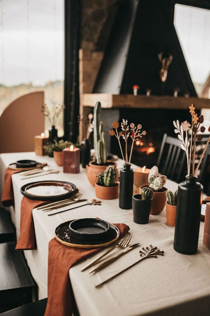 Use matte dinnerware, dark linens, and pops of metallic gold for contrast.