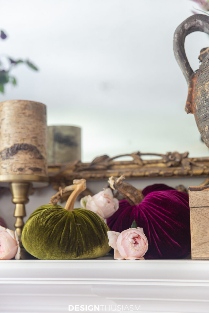 2. Dress Up Your Mantel With Velvet Pumpkins