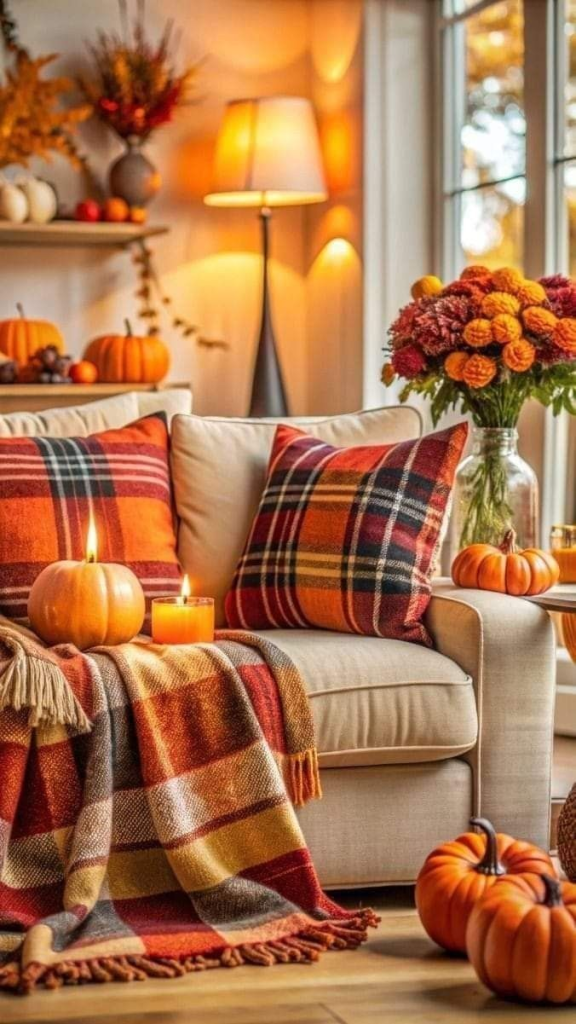 Drape plaid throws over chairs or sofas to add rustic warmth. Choose patterns in muted fall colors like caramel, rust, or navy, and mix textures like wool and flannel.