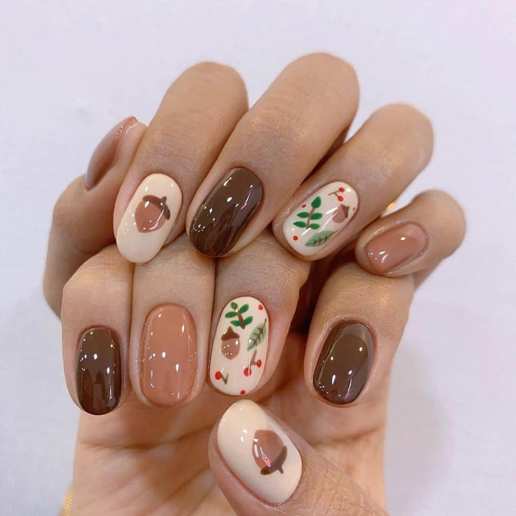 The design mixes tiny acorn details with glossy nude and neutral shades, making it subtle but still perfectly seasonal.