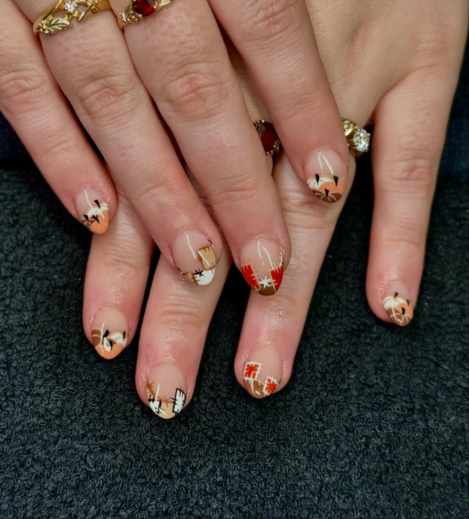 Tiny scarecrows and pumpkins sit right along the tips, acting like the cutest fall-themed French manicure.