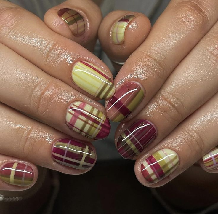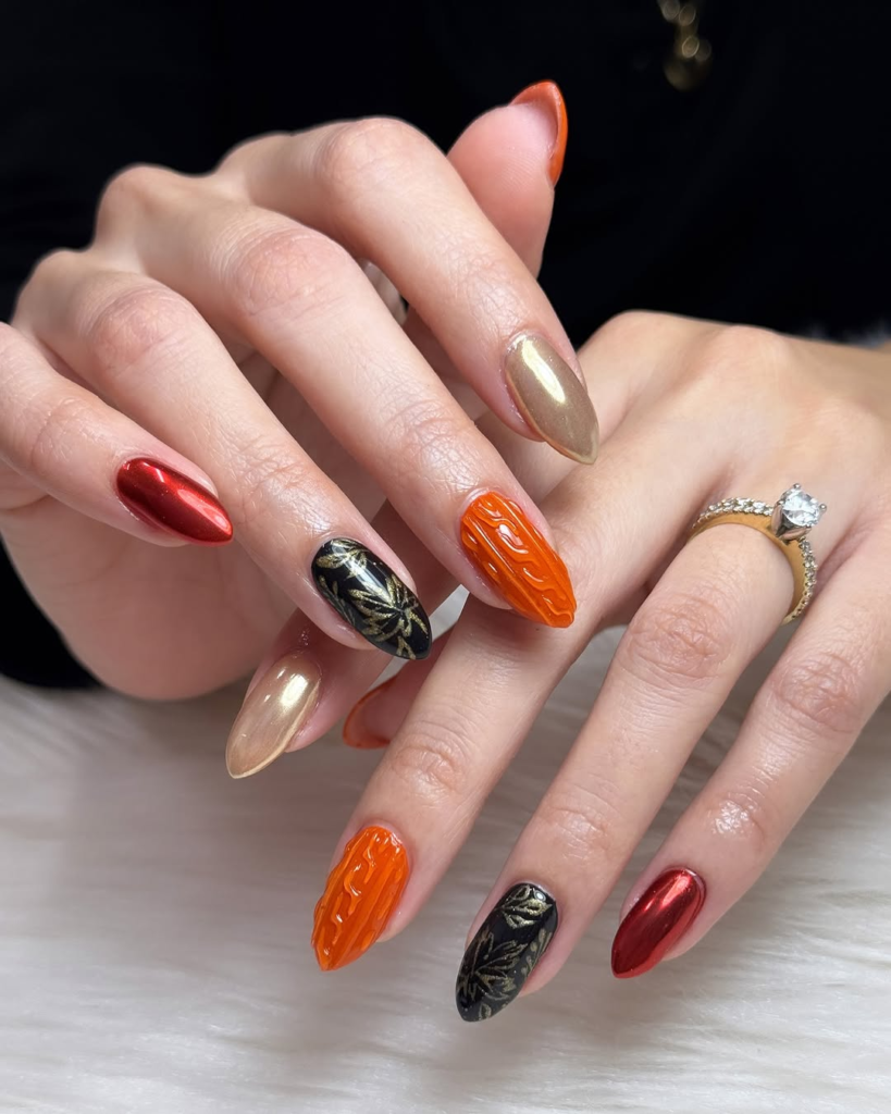 A few nails have that raised, knitted texture, while the rest are glossy and smooth in warm shades like red and chestnut.