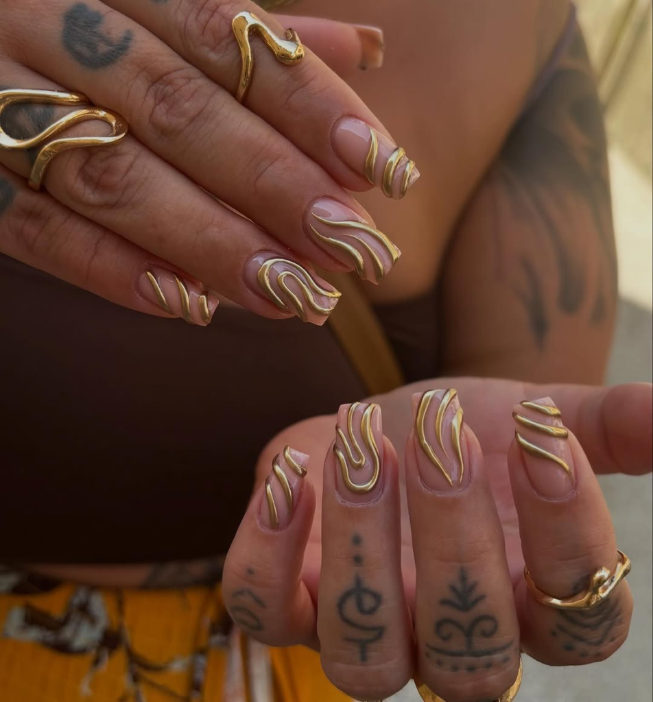 Thin metallic gold lines run across nude or beige nails for a minimal, eye-catching finish that goes with everything.