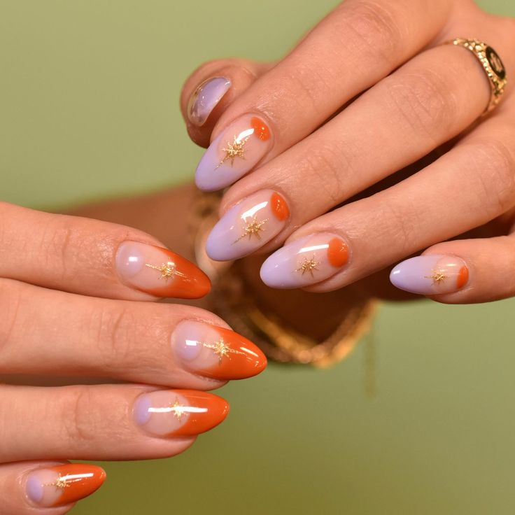 Each nail features an orange negative space base with a soft hint of pastel purple along the sides.