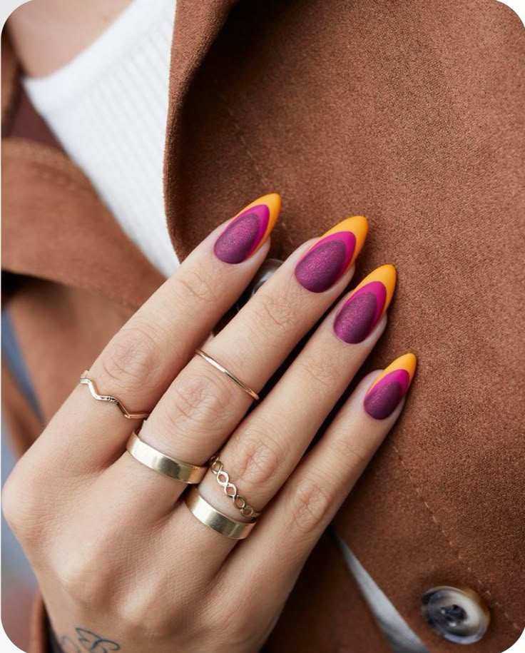 The top section is a soft orange, the middle line fades into a pinkish burgundy, and the bottom is finished with a mauvy burgundy glitter that ties everything together.
