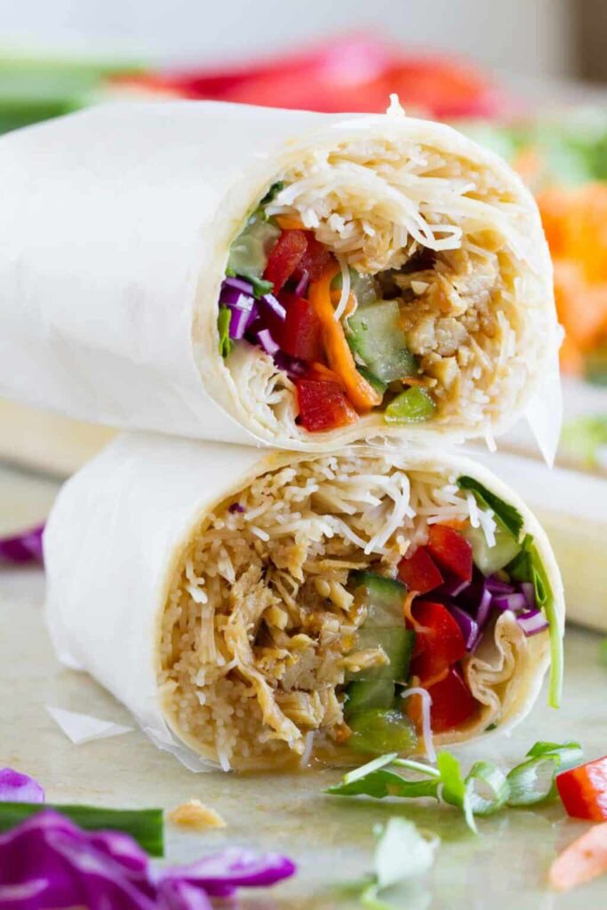 This wrap is an explosion of flavor, thanks to a rich, creamy peanut sauce coating the chicken.