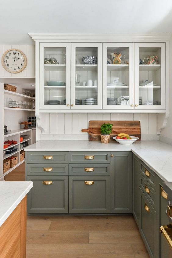 10. Dark Green Lowers and White Uppers Kitchen cabinets