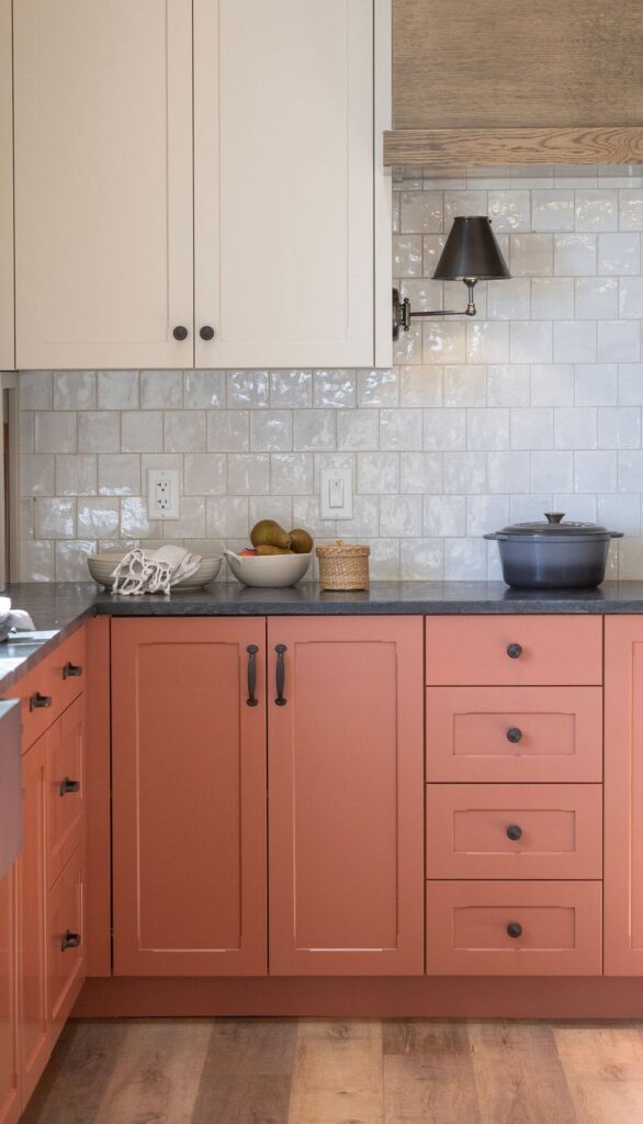 Terracotta brings warmth without being loud, and when paired with off-white uppers, the whole kitchen feels grounded.