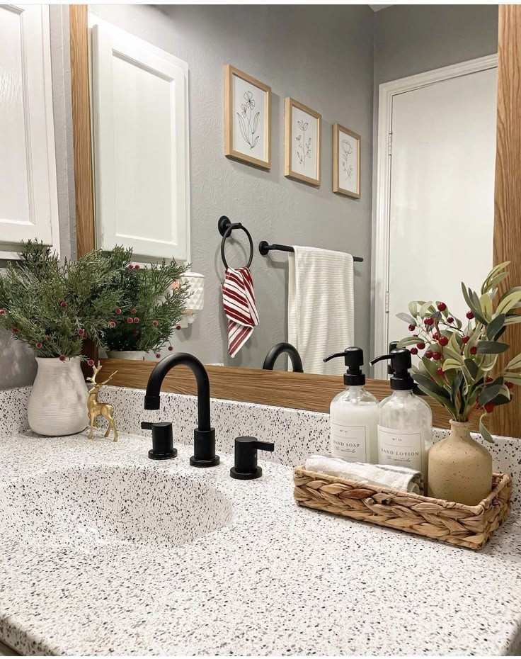 Neutral towels, consistent containers, and clean lines go further than themed decor.