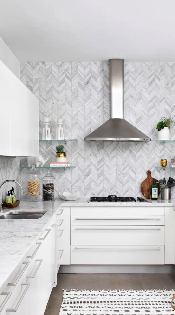Laying tiles in a chevron pattern isn’t just about choosing a design, it’s about making a statement in your white kitchen backsplash.
