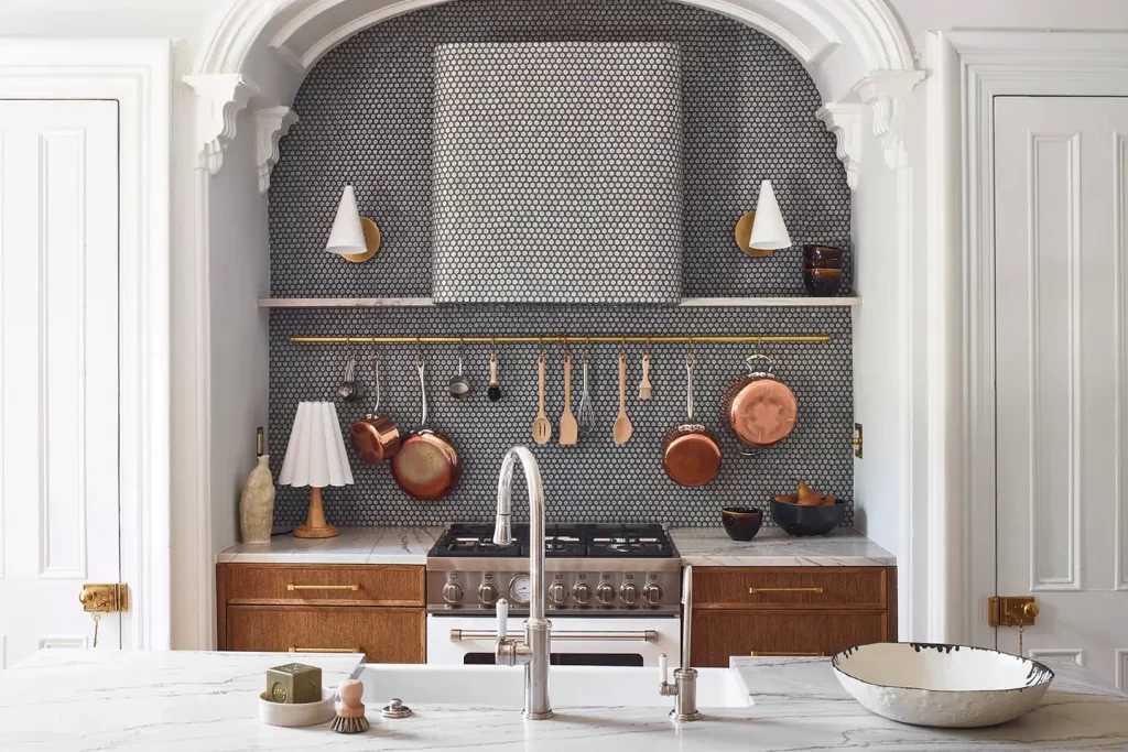 These small, circular tiles offer a fun and whimsical touch, transforming a simple white kitchen backsplash with their captivating design.