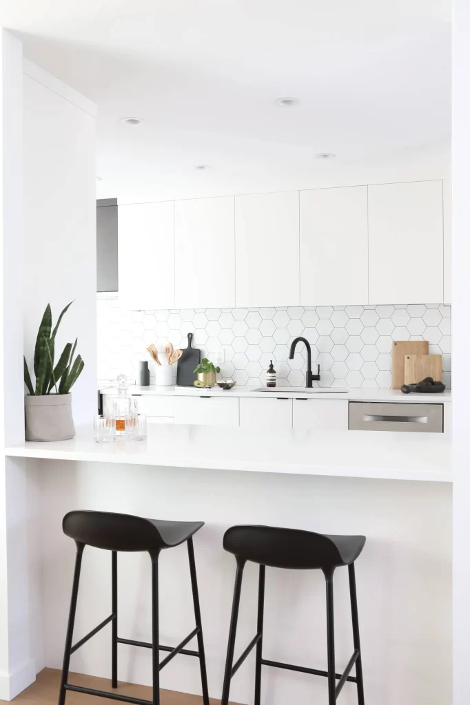 In a white kitchen, Hexagonal tiles stand out, adding a touch of sophistication while giving the space a fresh and contemporary vibe.