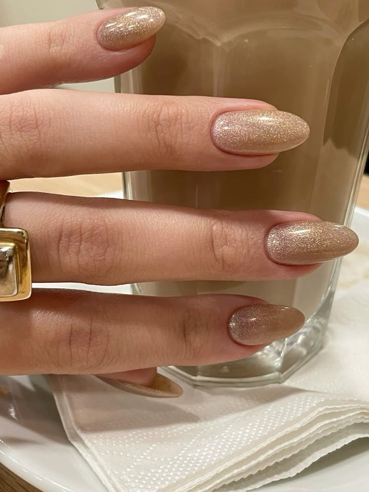 Champagne gold nails have that soft shimmer that pairs perfectly with cozy knits and sparkly holiday lights.